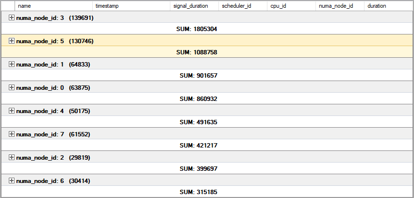 - SQL Server’s Soft-NUMA tried to further optimize this, resulting in 8 nodes with an uneven split: alternating between 8 and 7 CPUs per node.
