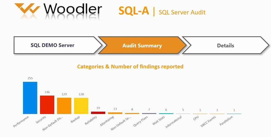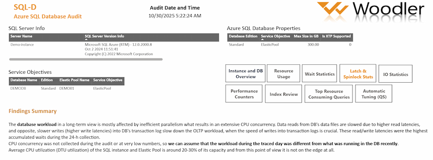 SQL-D audit is delivered as a Power BI report which consists of several reports divided into multiple categories based on specific configuration and performance areas.
